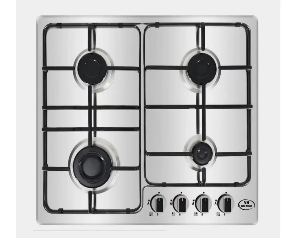 El tope NERO VH-6008SS-EN está fabricado en acero inoxidable y diseñado para ofrecer rendimiento y elegancia. Cuenta con 4 hornillas a gas, encendido eléctrico, parrillas individuales de hierro fundido y perillas de lujo. Su diseño empotrable y medidas de 630x540x120 mm lo hacen ideal para cocinas modernas. Configurado para operar con Gas L.P. a presión de 2.75 kPa, ofrece potencias térmicas variadas para diferentes tipos de cocción.